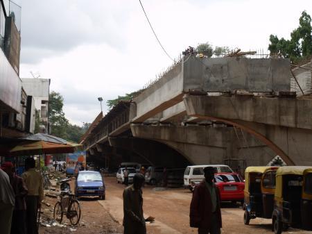 Au milieu de la rue, la municipalité est entrain de construire un pont.