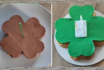 En déco j'ai fait très simple : rien sur celui au chocolat ;-) et de la pâte à sucre verte sur celui à la mangue pour rappeler le trèfle à 4 feuilles!