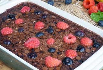Versez la préparation dans un moule recouvert de papier sulfurisé parsemez de pépites de chocolat et de framboises ou fraises ou fruits de saison.