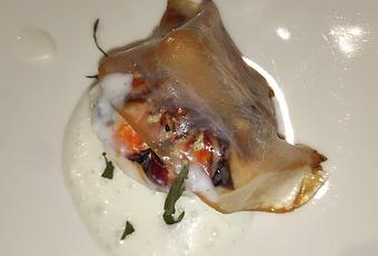 Puis c'est de la langouste sur un lard de colonnata, crème de mascarpone et fumet à la tomate, croquant de pistaches et de cacahuètes grillées et fumées