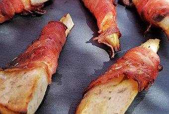 2) Enrouler chaque morceaux de poires dans une tranche de lard et les déposer sur une plaque recouverte de papier sulfurisé