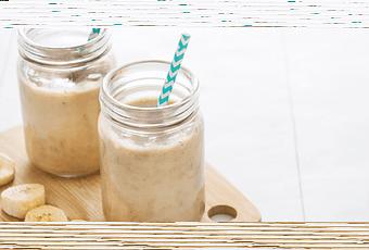 - Dans un mixeur, ajoute la banane, la protéine en poudre et le lait.