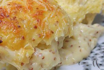 3) Faire fondre le beurre dans une casserole. Ajouter la farine et mélanger. Verser progressivement le lait aromatisé en remuant énergiquement pour éviter les grumeaux. Dès que la sauce a épaissi ajouter la moutarde et la moitié du gouda. Saler et poivrer