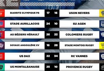 Au classement, Vannes creuse un écart de plus en plus intéressant : 7 points d'avance sur Montauban et 8 sur Provence. Mais ça se tient derrière : notons le très bon début de saison du promu Valence-Romans (19 points) qui partage la 4ème place avec Mont-de-Marsan et Brive, candidats à l'accession. Par contre, en bas de tableau, les maillons faibles se distinguent un peu plus : Rouen (8 points) semble déjà en grosse difficulté. Soyaux-Angoulême (10) est aussi en posture délicate et pourrait ne pas échapper cette fois à la descente. Avec 12 points, Dax n'est pas non plus serein comme Colomiers (c'est plus étonnant). Mais cette PaPro D2 est très incertaine.