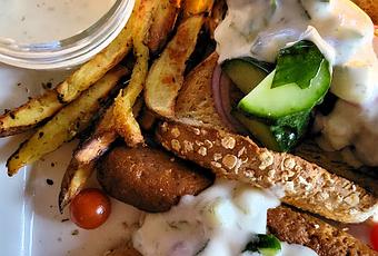 Avec des frites au four (avec huile, citron, levure, sel origan)