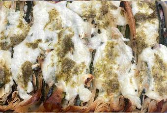 9. Recouvrir le millefeuilles de mozzarella coupée. Badigeonner de pistou maison de préférence ;). http://fabicooking.com/pistou-maison/