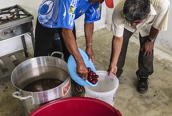 La communauté est en train de tester une machine qui leur permettra de séparer la chair et le noyau de la coquille du fruit de l'aguaje. Il faut comprendre que c'est un immense pas pour des producteurs de transformer eux-mêmes le produit de leur récolte, éliminant ainsi des intermédiaires grugeant pratiquement tout le profit.