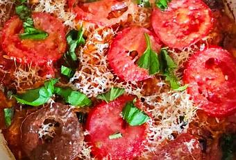 - Enlever le couvercle de la sauteuse (ou le papier aluminium), répartir les tranches de tomates, saupoudrer de parmesan et remettre au four 10-12 mn ou jusqu'à ce que le plat soit légèrement doré.
