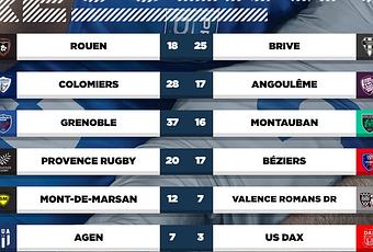 Vannes continue sa marche en avant et sur Biarritz. Provence s'en sort de justesse contre Béziers. Pour Rouen, le maintien s'annonce difficile après cette défaite à domicile contre Brive. La lourde chute de Montauban à Grenoble (qui s'est vue confirmer sa pénalité de points) laisse Mont-de-Marsan prendre la troisième place