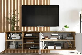 Une fois le meuble posé, il est temps d’y poser la télé (ou de la fixer au-dessus) et ses appareils connectés. Assurez-vous que le meuble soit correctement fixé peut accueillir le poids de votre télé et de ses appareils connexes.