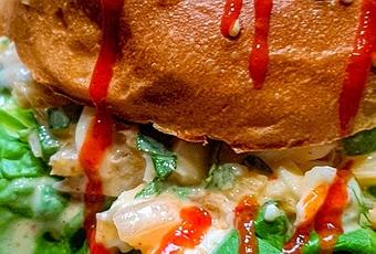 Toaster le pain tarnché en deux, garnir d'une feuille de laitue et d'une belle quanbtoté de salade d'oeuf au kimchi. Servir avec un trait de srirasha (ou pas).