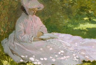Dans La Liseuse (1872) de Monet, l’immobilité superlative de la jeune lectrice — encapsulée, à la façon d’une huître, entre les deux coques oblongues du feuillage et de son ombre incurvée — est comme dérangée, comme vivifiée, et l’obscurité de son refuge comme éclairé par la motilité erratique de ces petites gouttelettes de lumière qui emperlent le rose nacré, le velouté de sucre glace de sa robe étalée et, plus grossièrement, l’herbe à proximité.