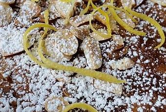 - Dans une poêle chaude, faire torréfier les amandes effilées et les répartir sur le gâteau, saupoudrer de sucre glace et répartir le reste du zeste de citron.