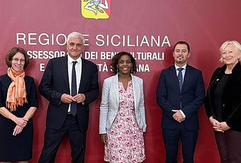 Photo 1 - De gauche à droite : Claire Thuaudet Conseillère culturelle à l'Ambassade de France à Rome, Hervé MORIN, Président de la Région Normandie, Lise MOUTOUMALAYA, Consule générale de France à Naples, Francesco Paolo SCARPINATO, Conseiller régional pour le patrimoine culturel et l'identité sicilienne, Catherine MORIN-DESAILLY, conseillère régionale et sénatrice Photo 2 : Entretien avec Gaetano GALVAGNO, Président de l'Assemblée régionale sicilienne crédits (c) Région Normandie