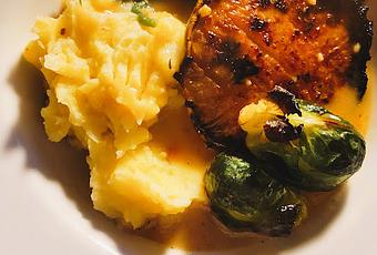 C'est servi avec une purée de pommes de terre et carottes, des choux de Bruxelles blanchis, puis terminés au four avec la même marinade que les steaks, pendant 5-10 minutes, et des haricots verts.