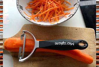 Chez Microplane, mon outil préféré reste le grand zesteur, le premier qui a été produit par la marque, comme de nombreux chefs d’ailleurs.Mais j’utilise aussi depuis des années l’éplucheur à lame droite. J’apprécie sa double-lame en acier inoxydable ultra-aiguisée pour sa capacité à pivoter pour épouser au plus près les contours des fruits et légumes. Autant une telle sophistication n’est pas indispensable pour les carottes ou les pommes de terre autant elle devient très utile pour la patate douce, le céleri et tous ces potimarons et courges à la peau dure et parfois bosselée. Il est idéal aussi pour les fruits fragiles comme la pêche et la tomate quand on ne veut pas en garder la peau. Il glisse sur les chairs sans les écraser. Il existe aussi un économe à lame dentelée, et même un économe format XL pour éplucher les peaux très épaisses et les fruits ou légumes de grande taille. Mais voici qu’en ce mois d’octobre, apparaît la gamme d’éplucheurs en Y parmi lesquels je suis devenue inconditionnelle de l’éplucheur à julienne. Je l’ai testé et je ne saurais désormais m’en passer. Le nettoyage à l’eau claire est rapide mais on peut aussi opter pour le lave-vaisselle.Si l’on est puriste on cherchera à obtenir des bâtonnets fins de section carrée, de 2 millimètres. Autant dire qu’avec un couteau c’est l’affaire de spécialiste et d’énormément d’entraînement. Avec le nouveau Y, une fois l’avoir bien pris en main la découpe relève quasiment de la magie.Certes, il faut poser le légume bien à plat et travailler de gauche à droite (l’inverse pour les gauchers, sachant que l’outil convient à toutes les l’attristions) mais l’ergonomie du manche Soft Touch anti- dérapant est bien étudiée et son poids rend le mouvement très sûr. Il ne faut pas hésiter à bien appuyer au début mais ensuite la lame glisse seule. Il ne reste qu’à séparer les bâtonnets. Les photos parlent d’elle-même.