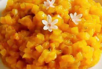 Et, on peut le faire aussi avec des légumes. La courge se prête particulière à la préparation. Ici, j'ai utilisé une butternut qui commençait à s'abîmer... Bien entendu, contrairement aux céréales, la courge n'a pas un pouvoir absorbant, mais, pour cuire, elle a quand même besoin de liquide ou, tout au moins, elle a besoin de cuire dans son jus.