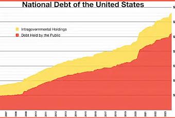 À ce jour, nous avons réussi à accumuler une dette de 33 700 milliards de dollars, due en partie aux réductions d’impôts de Reagan dans les années 80, à la guerre en Afghanistan et en Irak et à la crise financière de 2008 sous Bush, aux subventions liées au Covid-19, aux réductions d’impôts de Trump et aux récents investissement en infrastructure et environnement de Biden.