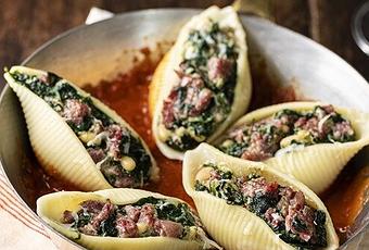Pour ma recette d'automne à base de Cotechino Modena IGP, une 'saucisse' de viande de porc, j'avais farci de grosse pâtes italiennes 'coquillages' d'un mélange de Cotechino sauté, épinards, ricotta de brebis et pignons de pin, gratinées sur une sauce aux tomates onctueuse...