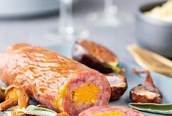 Remplir le vide créé avec la farce au potimarron grâce à la poche à douille. Faire prendre au frais, une bonne heure, roulé dans du papier alimentaire.