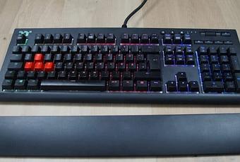 Lorsque vous tenez le TT Premium X1 RGB dans votre main pour la première fois, vous remarquez que vous n’avez pas beaucoup réfléchi à un design extraordinaire. Il n’y a pas d’ornements et tout est simple. On remarque cependant que l’emballage contient 8 capuchons de touches rouges supplémentaires. Ceux-ci sont étiquetés avec Q, W, E, R, A, S, D et F. De plus, un outil d’extraction pour les capuchons est directement inclus dans la livraison. Enfin, le carton contient un repose-poignets amovible, qui ne devrait pas manquer sur les claviers de jeu de haute qualité. La particularité de cette édition est qu’elle est maintenue par des aimants sur le clavier. Cela le maintient fermement attaché au clavier lorsque vous le déplacez, mais en même temps, il peut être retiré sans trop d’effort.