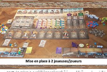 Le livret de règles de jeu est bien écrit il y a plein d’exemples illustrés, vous y reviendrez très certainement lors de vos premières parties car les différents points de règles concernant les différentes zones du plateau principale peuvent être un peu lourdes à assimiler. Comptez bien 2h30 pour vos premières parties. Je vous conseille d’ailleurs de commencer à 2 joueurs pour prendre le jeu en main plus rapidement tout en diminuant le temps d’attente entre vos tours de jeu. A 4 prenez votre soirée :-). Plus vous progresserez dans votre partie plus vous développerez votre plateau Joueur en y associant des Traducteurs mis à la retraite suite à leurs efforts. Ils vous apporteront des actions supplémentaires. Le jeu a une bonne courbe d’apprentissage, et la 1ère partie pourra vous paraître un peu frustrante. En 4ème de couverture du livret de règles retrouvez une légende pour toutes les icônes rencontrées. Le jeu reste tout de même plaisant et le temps n’est pas si long qu’il n’y paraît :-).