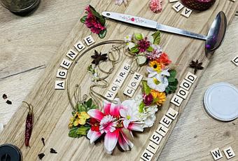 Lors de ma visite à l’Abri, j’ai également mis la main sur des éléments vintages, et des éléments de décoration qui ont immédiatement évoqué l’image de mon agence. L’idée de créer une planche déco personnalisée était née. Les lettres ont été assemblées pour former le nom de mon agence, et les éléments de décorations on pu accueillir des épices ou encore des fleurs et des illustrations représentant notre identité visuelle. Le résultat est une pièce unique qui ornera fièrement les murs de notre espace de travail.