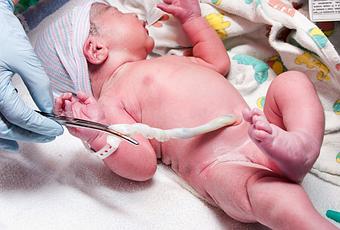 - le clampage du cordon qui est la procédure standard : la procédure prend entre 30 et 180 secondes, et laisse le temps au sang de circuler dans le corps et aux poumons du nourrisson de se remplir d’air ;