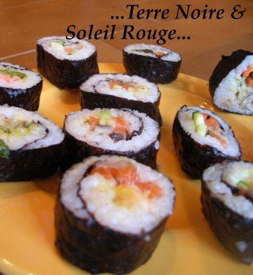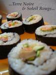 Ingrédients (pour 5 rouleaux de six à huit Makis, donc heuuuu... 4 soleils levant omnivores^^ et une petit végé cachée derrière son nuage xD)