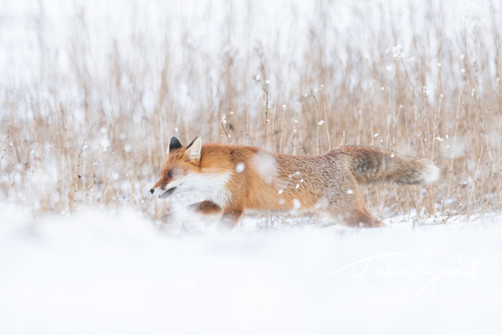 Soudain, un renard décide de s’approcher au pas de course. Il traverse les herbes sèches en ondulant et passe à quelques mètres de mon affût. Le contraste entre le beau roux de sa robe, les herbes sèches et la neige est saisissant. J’espère que l’autofocus de l’appareil photo ne m’a pas fait défaut… Une fois le renard passé, je regarde nerveusement les images et découvre avec joie qu’elles sont comme je les avais rêvées. Voici donc quelques clichés de renard roux réalisées dans durant l’hiver le plus froid du reste de notre vie.