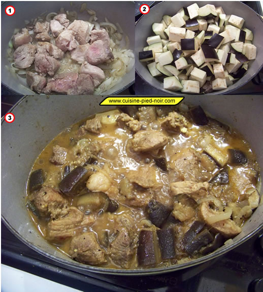 Ajoutez les aubergines coupées en cubes de 2 à 3cm. Ajoutez les épices et 4cl d'eau, salez, mélangez et laissez cuire à petit feu et à couvert pendant 1 heure en remuant de temps en temps. Vérifiez que ça n'attache pas et ajoutez au besoin un petit peu d'eau.