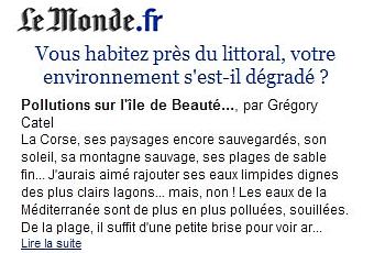 Dans mon article de rentrée à propos de la Corse, (voir " Pollutions sur l'île de Beauté"), j'expliquais que le littoral corse me semblait de moins en moins propre, et parlais de la qualité des eaux de baignade, des cochonneries en tout genre qu'on y trouve, des dégazages au large, et des 4x4 des touristes !