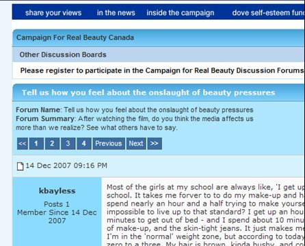 Le panneau était aussi l'occasion d'inviter les gens à se rendre sur le site Web www.campaignforrealbeauty.ca dans lequel un forum aborde divers sujets toujours relatifs à la beauté et sur lequel, jeunes et moins jeunes s'expriment sur : qu'est-ce que la beauté, comment vivre la pression des médias, qu'est-ce que l'estime de soi, le sentiment de vieillir, etc.
