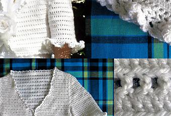 Alors, ŕ défaut de ressortir toutes les petites tenues d'été comme nous en avions tous eu envie, voici une idée de petit boléro. Réalisé ŕ partir de la pelote géante que je vous avais présentée, il a été porté avec beaucoup d'élégance par Angčle lors de sa premičre communion, ŕ la fin du mois de mai.