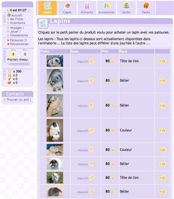 Tout d'abord, après la petite inscription gratuite de rigueur, vous aurez à acheter votre premier lapin (vous pouvez en avoir jusqu'à trois), et là, vous avez le choix en différentes races, différentes couleurs, des mâles et des femelles, et vous choisissez selon des photos de vrais lapins :
