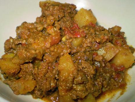 Dans une grande casserole faire revenir l’oignon dans l’huile chaude à feu moyen-haut jusqu’à bien doré. Ajouter l’ail et toutes les épices sauf le sel; mélanger et cuire une minute. Incorporer les tomates, la viande et le sel. Cuire le tout environ 10 minutes ou jusqu’à ce qu’il n’y ait plus de rose dans la viande.
