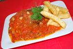 mettre l'huile d'olive à chauffer dans une poêle ajouter l'ail sans le laisser brunir, ajouter ensuite les tomates lavées et coupées en morceaux ( vous pouvez les épépiner et enlever la peau mais moi, je n'ai pas eu le temps car j'avais bien travaillé et il était tard ) saler et poivrer, mettre un peu de pili pili ou du poivre de cayenne ( facultatif )