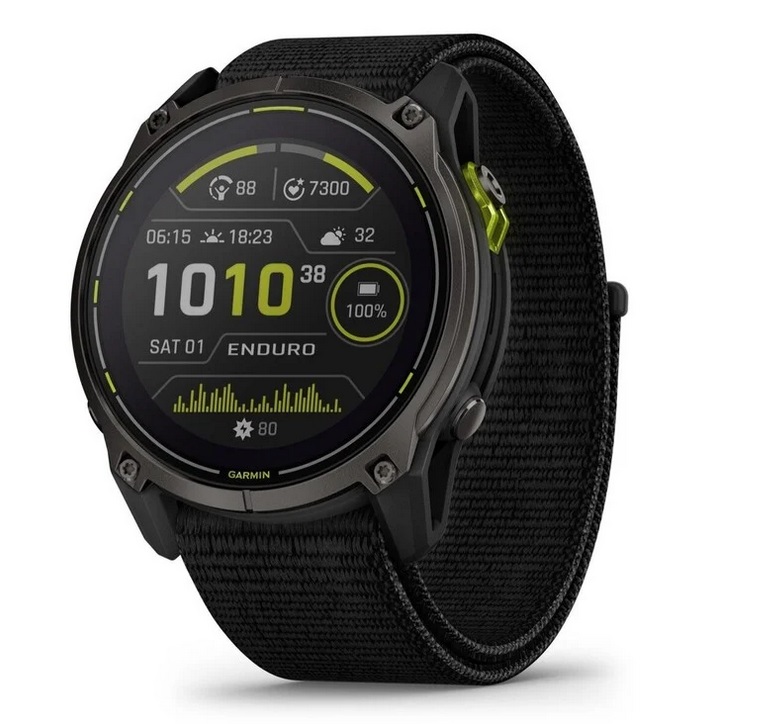 L’Enduro 3 ressemble visuellement fortement à l’Enduro 2. De nombreux détails sont repris : bracelet nylon UltraFit, garde du bouton Start jaune, rappels jaunes autour de l’écran, watchface.