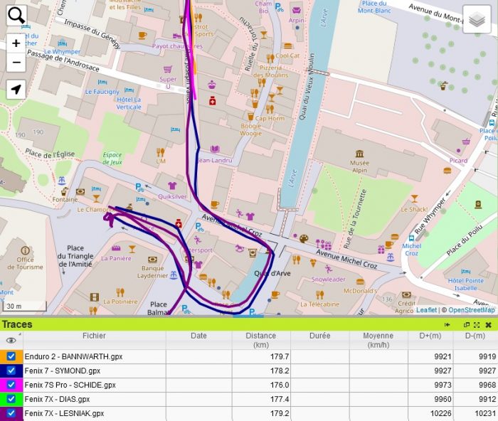 Sur 5 montres GPS, 2 sont bien parties depuis la ligne de départ. Les traces GPS des 3 autres commencent avec bien 500 m de retard. Problème de GPS fix avant de lancer l’activité. Je l’ai déjà dit, si vous n’attendez pas le GPS fix immobile, l’accroche sera encore plus longue en déplacement.