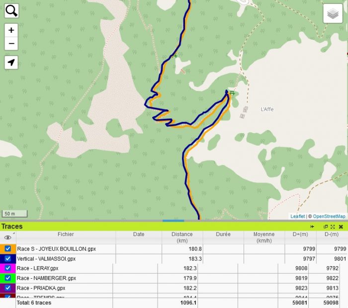Juste un peu plus loin, c’est déjà bien mieux. Cela dit, les traileurs se déplacent de la droite vers la gauche et on voit que toutes les traces GPS se superposent parfaitement dans la zone dégagée mais qu’une des 6 commence à dévier dès qu’elle rentre dans la forêt.