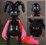 Ne vous inquiétez pas, tout est normal, c’est juste le nouveau projet de T9G qui porte le doux nom de Yumenoko Kodomo, produit par Medicom dans la célèbre série VCD et qui sortira dans 3 shops au Japon seulement avec très exactement 50 pièces. Complètement débilos/fatal avec un mélange de boa, de rubans, de tête de peluche noire avec un nez rouge, des bras décharnés roses sur un corps noir qui aurait pu appartenir à Chucky et une espèce de bonnet de bouffon.