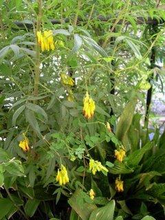 Dicentra scandens (qui court dans un oeillet d'Inde géant à odeur de pamplemousse, Tagetes lemonii)