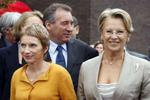 François Bayrou entouré de la présidente du patronat Laurence Parisot (à gauche) et de la ministre de l'Intérieur Michelle Alliot-Marie à l'université d'été du Medef. Le président du MoDem s'est déclaré pas convaincu par le mode de financement du revenu de solidarité active, qui selon lui va "peser sur les classes moyennes". /Photo prise le 29 août 2008/REUTERS/Charles Platiau