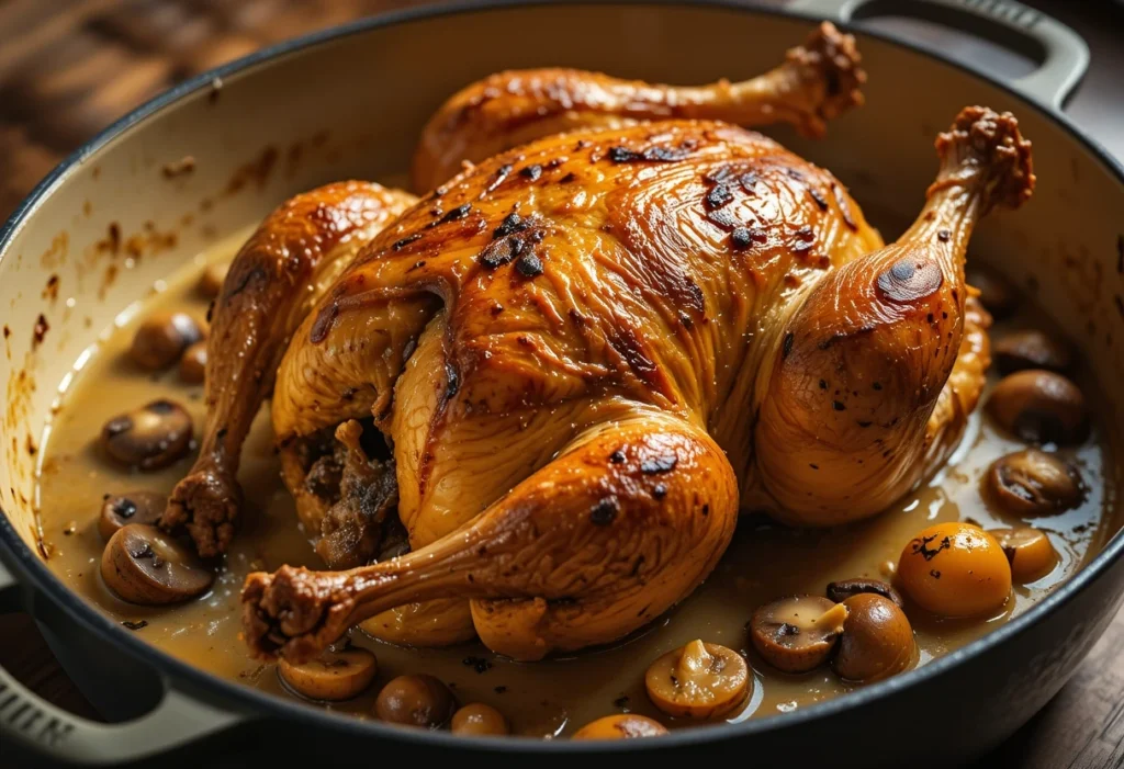 Laissez-les mijoter quelques minutes pour qu’ils absorbent les saveurs. Remettez ensuite la pintade dans la cocotte, ajoutez le bouillon ou le vin blanc, puis couvrez avec un couvercle hermétique. Enfournez pendant environ 1h30, en arrosant régulièrement la volaille avec le jus de cuisson pour éviter qu’elle ne se dessèche.
