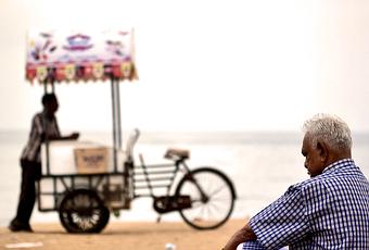 L'ancien comptoir français peine à se sortir de sa torpeur coloniale. Sa ville blanche, qui donne sur une mer grise et hermétique, baille son ennui sous les bougainvillées. La longue plage de Pondichéry offre un spectacle en suspens, estompée par la nostalgie et l'humidité, grouillante de personnages pensifs et à peu près immobiles. Plage comme un travelling avant bollywoodien, jonché de symboles usés et de clichés magnifiques: la vendeuse de ballons, le marchand de glaces, un dresseur de singe, un percussionniste, des amoureux qui s'isolent, quelques cerfs-volants et des joueurs de pétanque sans pastis ni cigales, arbitrés par les lunettes cerclées d'instituteur d'un haut Gandhi figé dans la pierre. A chacun sa saynète, à chacun son rôle, un peu à côté de son mouvement, sans vraiment lever la tête. A la fin du jour, les odeurs d'épices montent au-dessus de la mer. Les enfants resurgissent et rassemblent leur malice affamée autour des épis de maïs qu'on grille, retourne, mitonne ou mijote à feu doux; le petit feu tremblant et paisible des mères qui défient toutes ensemble la bruine fade.