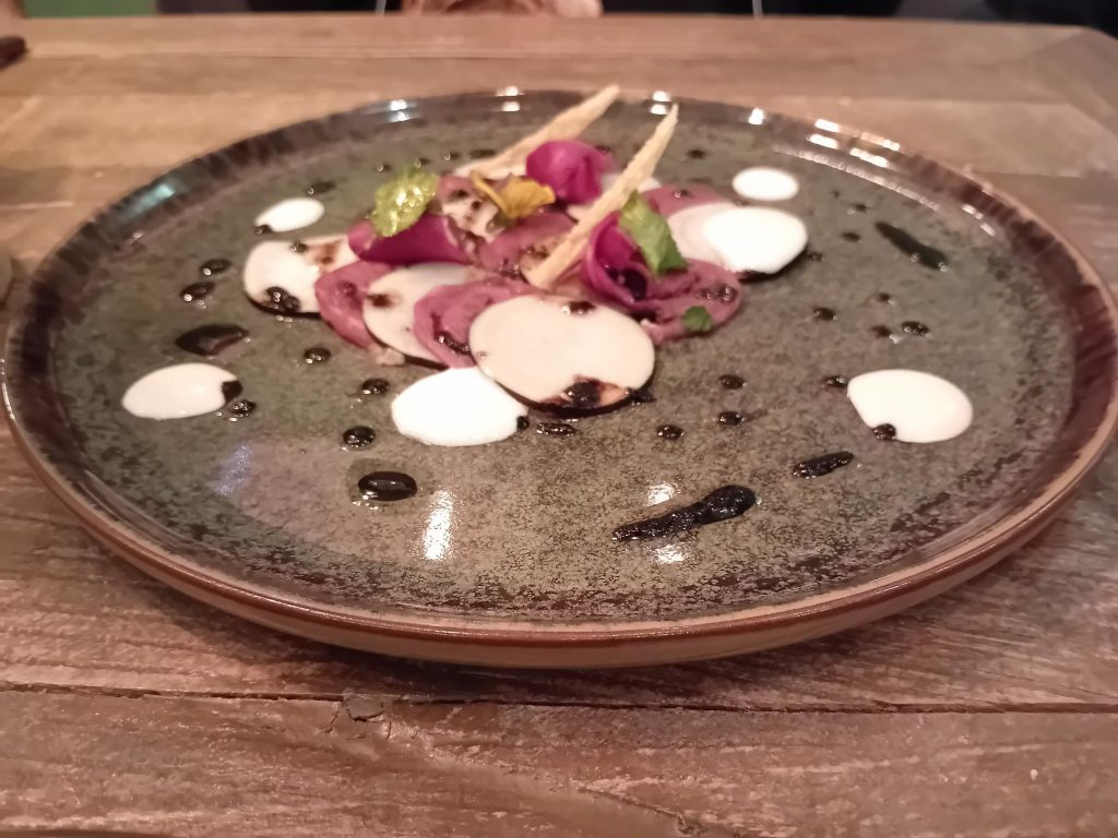 Ma convive a choisi le carpaccio de radis noir et magret de canard fumé maison, vinaigrette au café du domaine. Un mélange de textures surprenant.