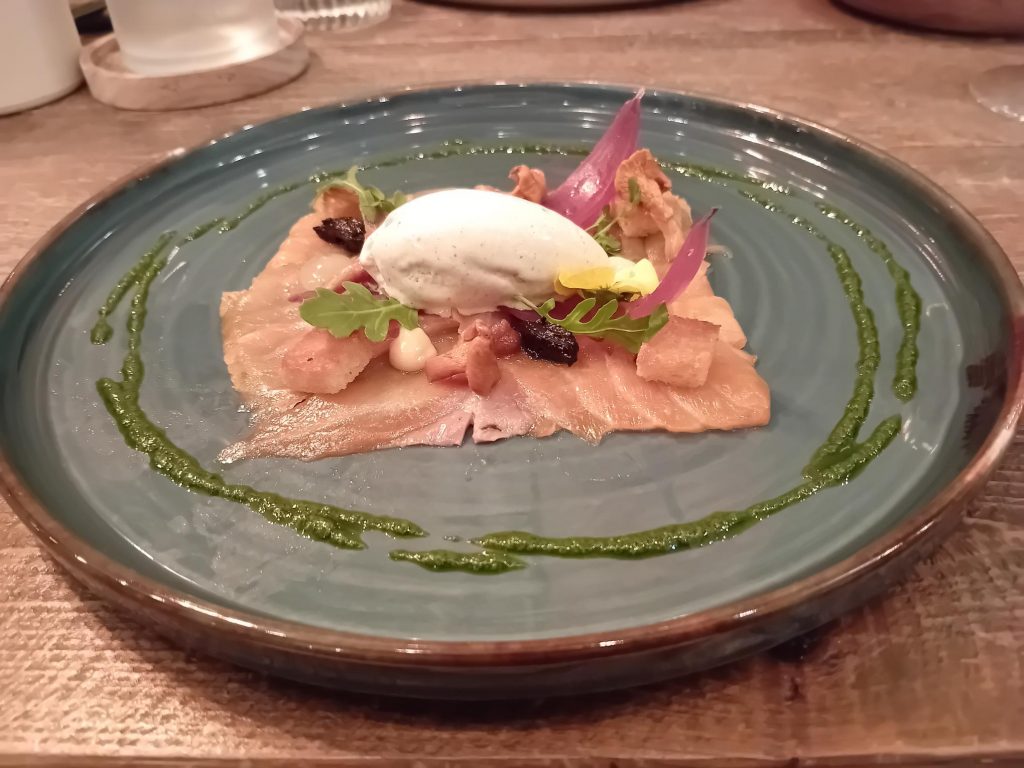 En entrée, j’ai opté pour la truite d’Essonne façon Gravlax, pickles, ciboulette, glace à la moutarde de meaux. Quelle belle surprise ! Déjà visuellement, une belle assiette aux couleurs harmonieuses. Et gustativement, une explosion de saveurs comme rarement rencontrée.