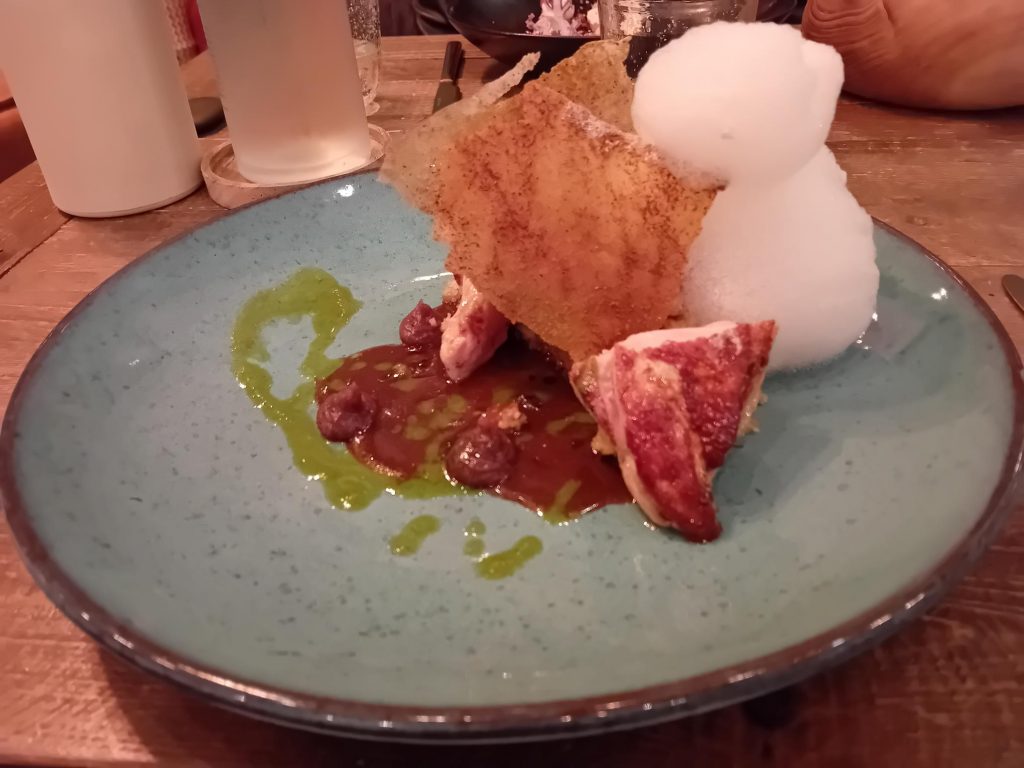 J’ai ensuite commandé le suprême de pintade roti, boulgour gros grain, dattes Medjouls et écume d’amande grillée. Avec une petite appréhension je dois bien le dire, car j’avais l’arrière pensée que cette partie de la volaille est un peu sèche ! Et pourtant… une cuisson parfaitement maîtrisée, presque rosée, pour une viande fondante. Un mariage de goûts très subtil, et une assiette tellement généreuse et bien présentée !