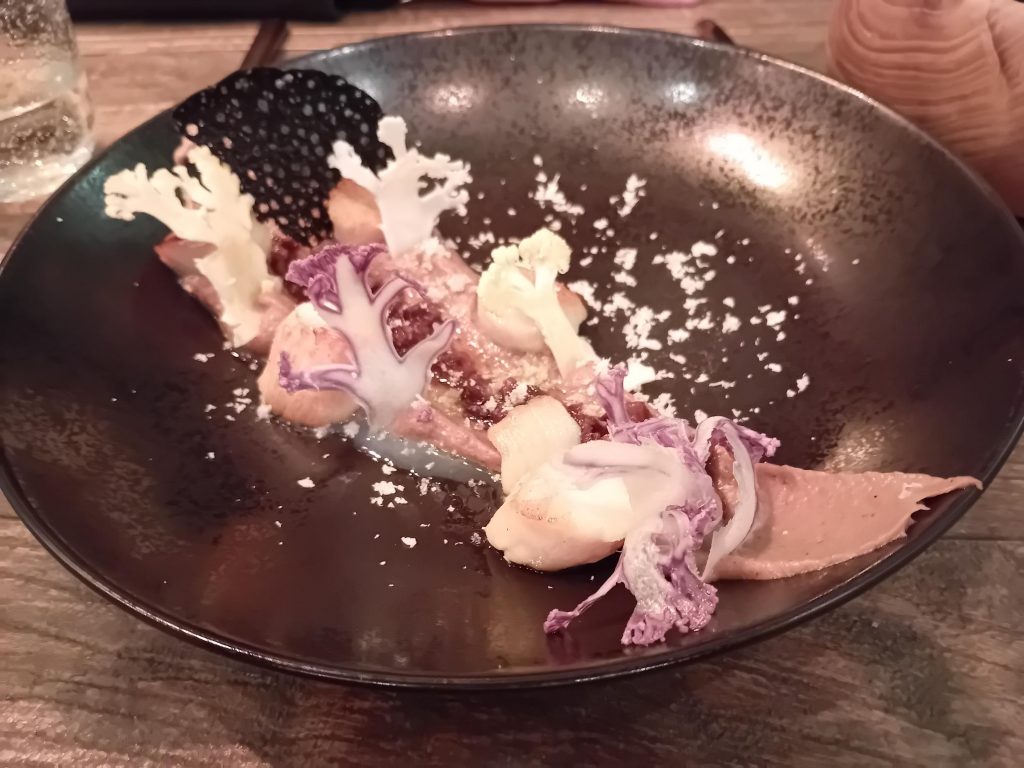 L’autre plat choisi, Saint-Jacques poelées, chou-fleur en trois façons, sauce comme une vinaigrette asiatique, est également préparé à la perfection. Une belle harmonie de saveurs.