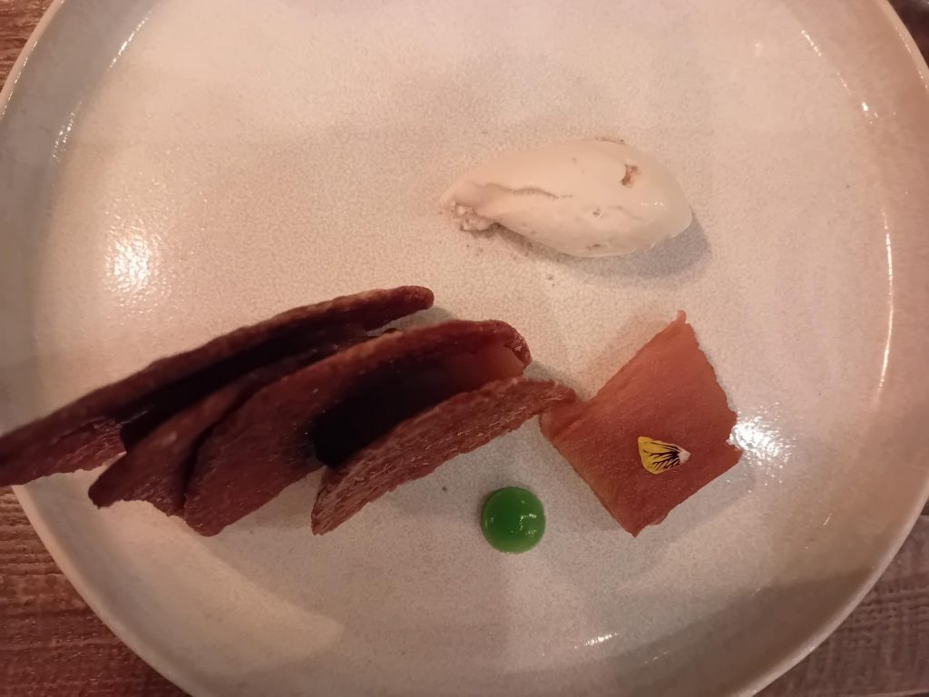 Et en guide de dessert, pour ma part, le gâteau aux pommes et ses sept heures de cuisson, glace végétale au caramel beurre salé, gel d’ortie, laurier et Arlette croustillante. Un dessert vegan absolument divin.
